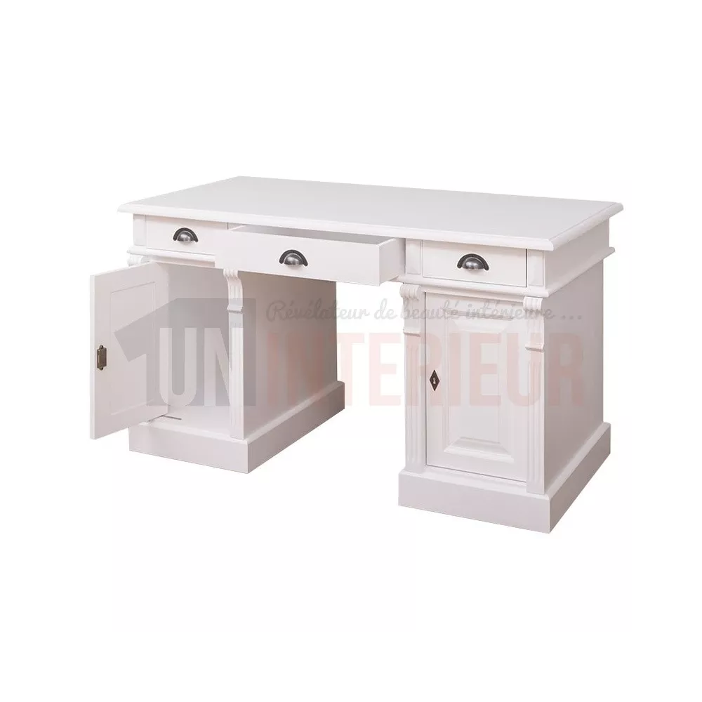 Un large bureau de 140cm, équipé de trois tiroirs et 2 portes aux décors travaillés. L'élégance, au bureau.