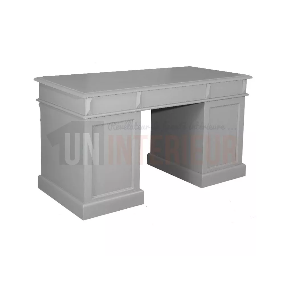Un large bureau de 140cm, équipé de trois tiroirs et 2 portes aux décors travaillés. L'élégance, au bureau.