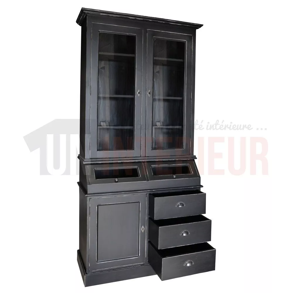 A l'intérieur, vous trouverez 6 petits tiroirs et 2 niches qui vous offriront un espace de rangement supplémentaire. La bibliothèque en pin (partie haute), est composée de 2 portes vitrées derrière lesquelles se trouvent 2 étagères qui vous permettront de ranger vos livres par exemple.
