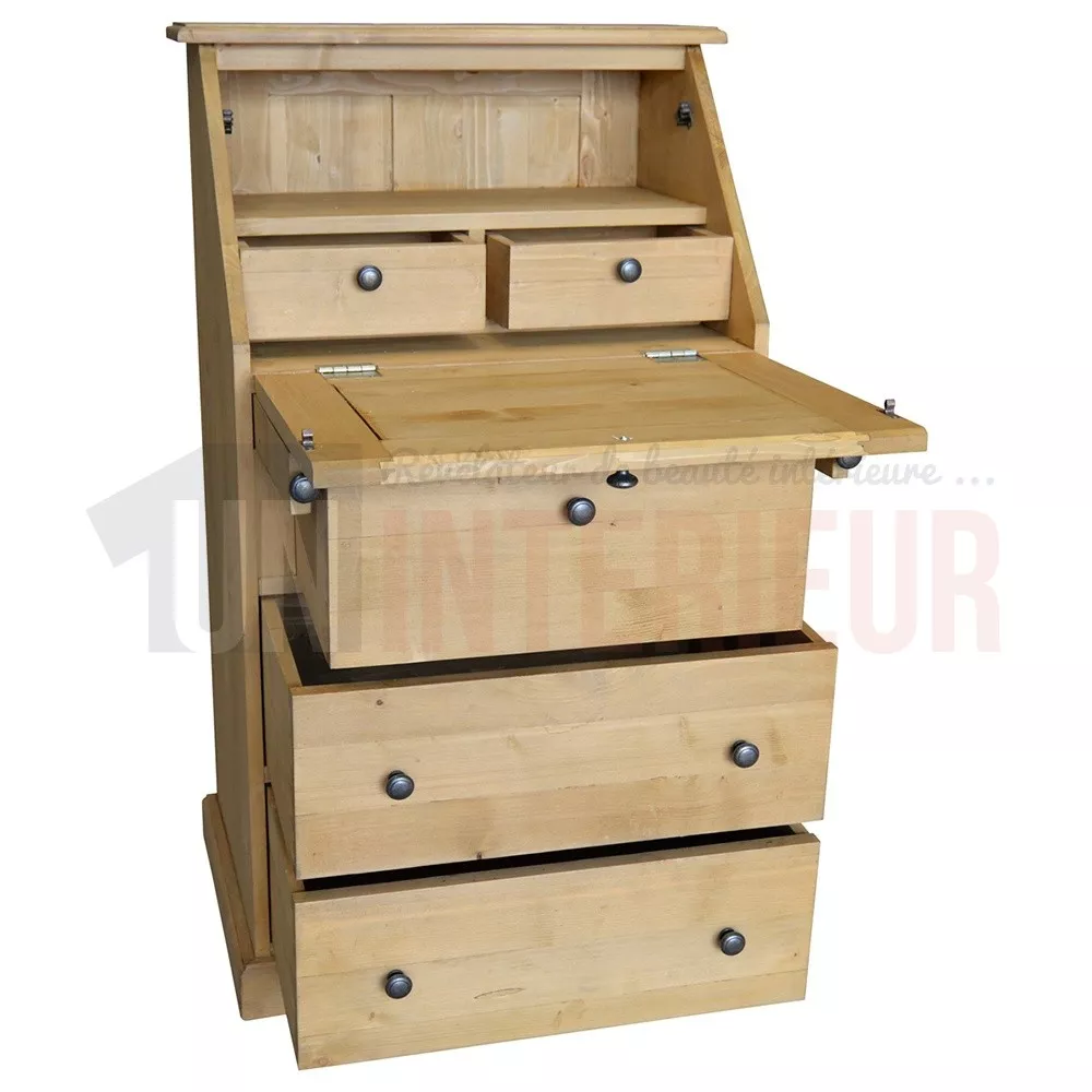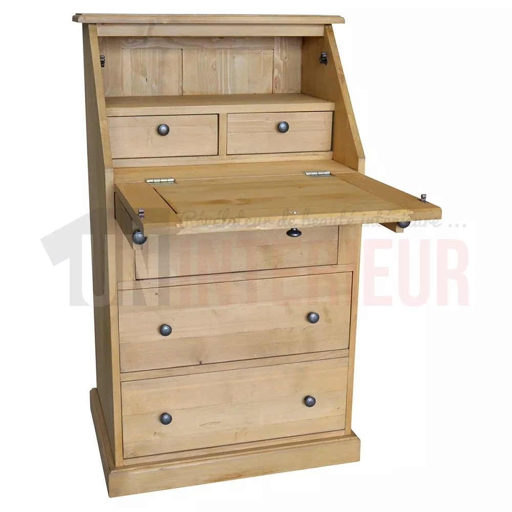 Ce bureau en pin type secrétaire, petit modèle de la gamme donkey est équipé de 3 tiroirs en partie basse ainsi que 2 tirettes sur lesquelles viendra se poser la porte une fois rabattue.