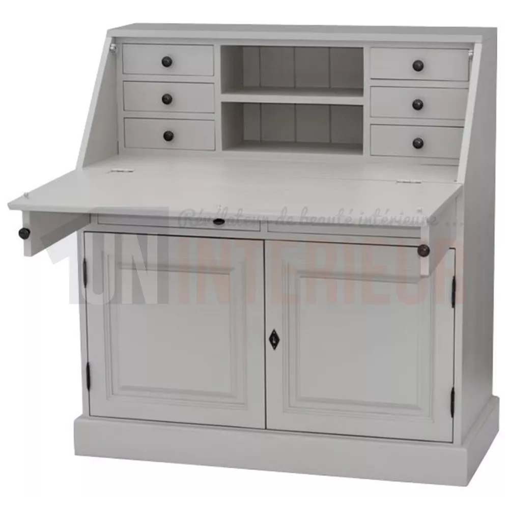 La partie haute, elle, cache derrière sa porte rabattable (qui vous servira de plateau une fois ouverte) 6 petits tiroirs et 2 niches.