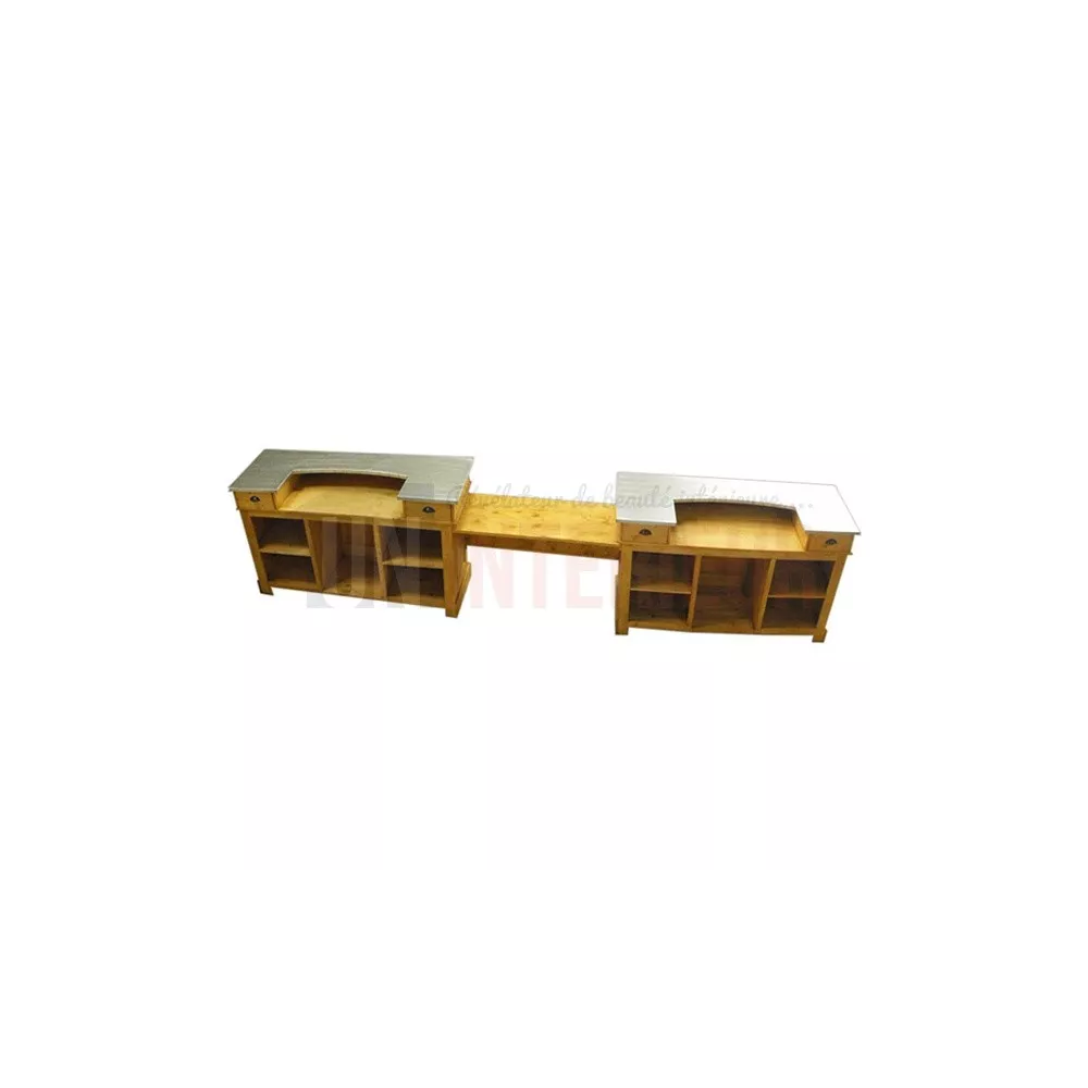Notre client était séduit par notre modèle Bar en pin massif 180cm - Chester, il a alors décidé de nous demander d'en jumeler deux avec un espace bureautique au centre.