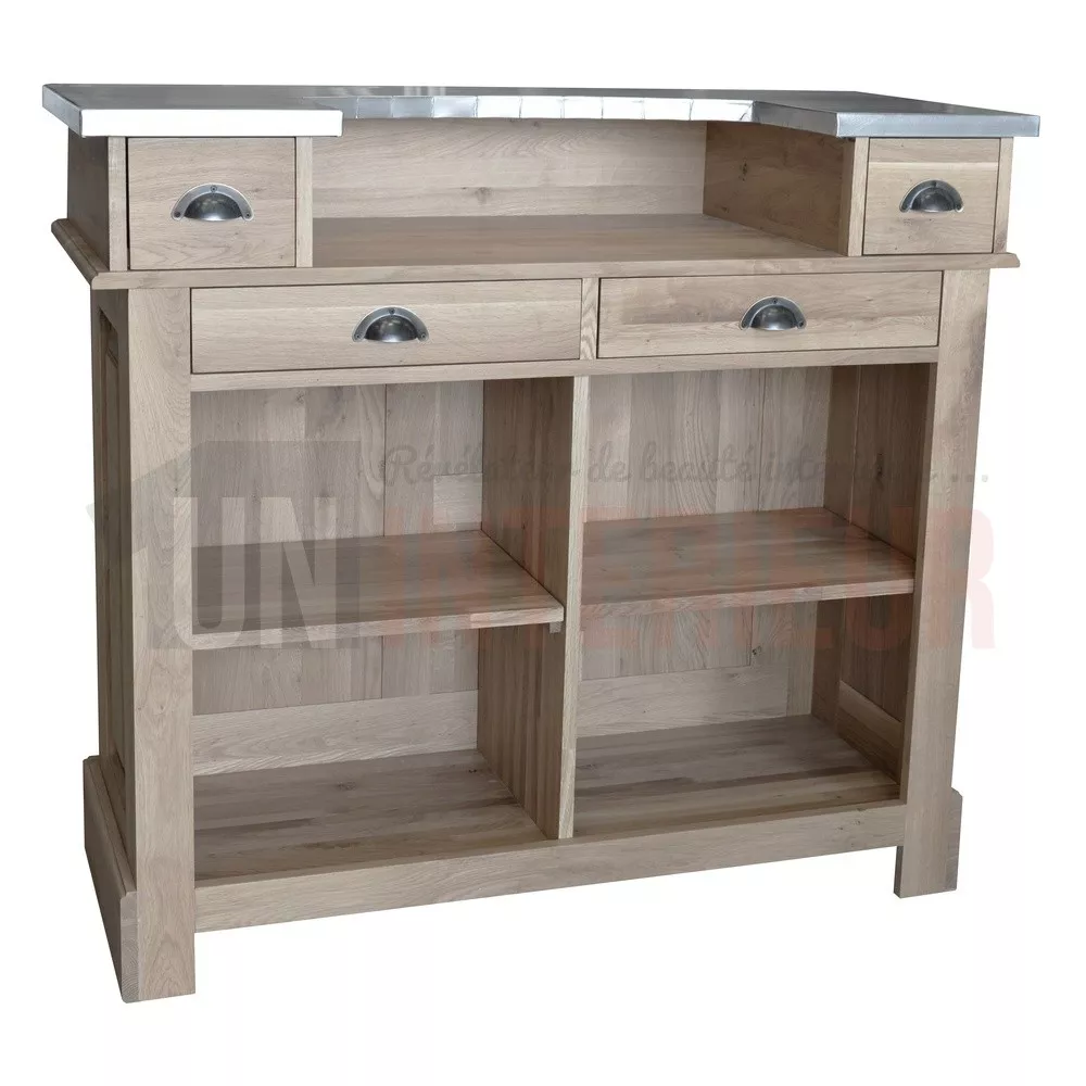 Adapté des anciens comptoirs de bistrot de l'époque, il est équipé de deux tiroirs de part et d'autre de la niche sous-plan et de 3 cellules avec étagères modulables.