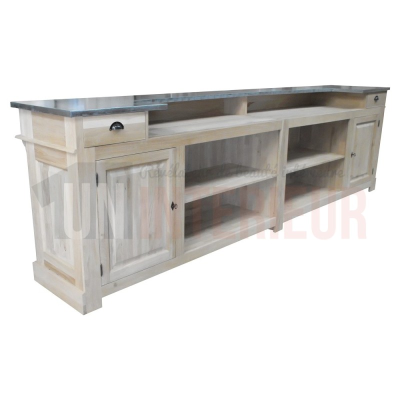 Comme pour le grand bar CHR en pin massif de 360cm, ce meuble est composé de deux parties de 180cm, fixées par des vis écrous.