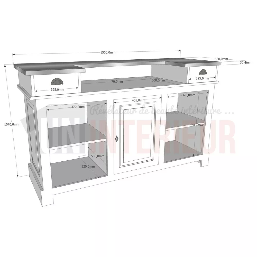 - Largeur = 150cm - Profondeur = 65cm - Hauteur = 107cm.