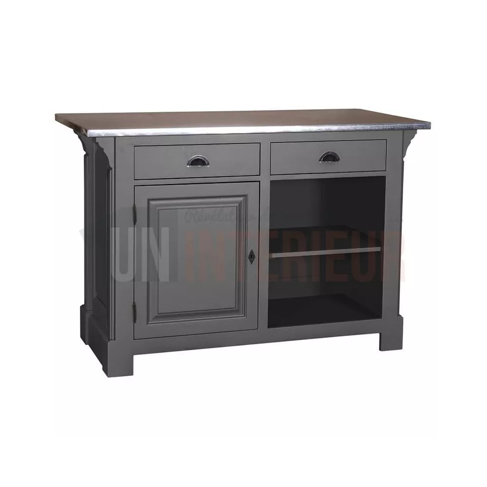 Ce meuble comptoir, peut-être utilisé comme passe-plat dans une cuisine ou meuble d'accueil en magasin.