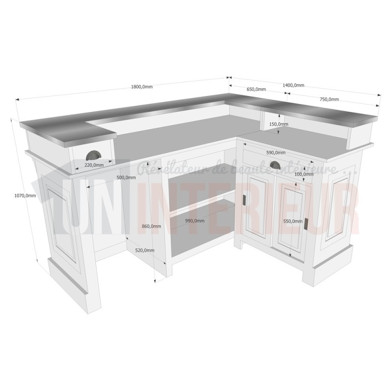 Ce modèle créé en 2017 élargit notre gamme de comptoirs de bar en angle. Ainsi, vous disposerez sur ce modèle d'un espace de 180cm x 140cm, pouvant s'adapter aussi bien dans les petits espaces que dans les grands.