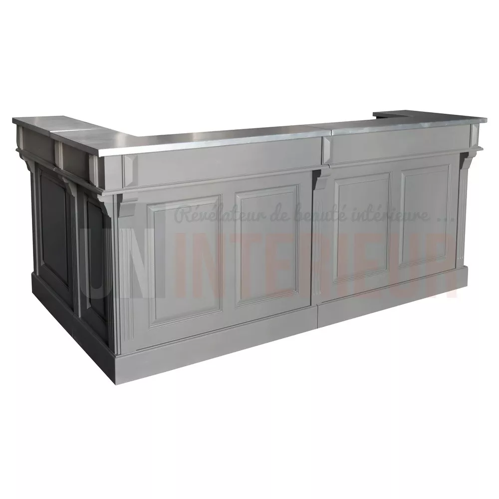 Ce modèle créé en 2017 élargit notre gamme de comptoirs de bar en angle. Ainsi, vous disposerez sur ce modèle d'un espace de 240cm x 140cm, qui s'adaptera à votre intérieur et apportera une touche de modernité à ce dernier grâce à son plateau en Zinc Acier.