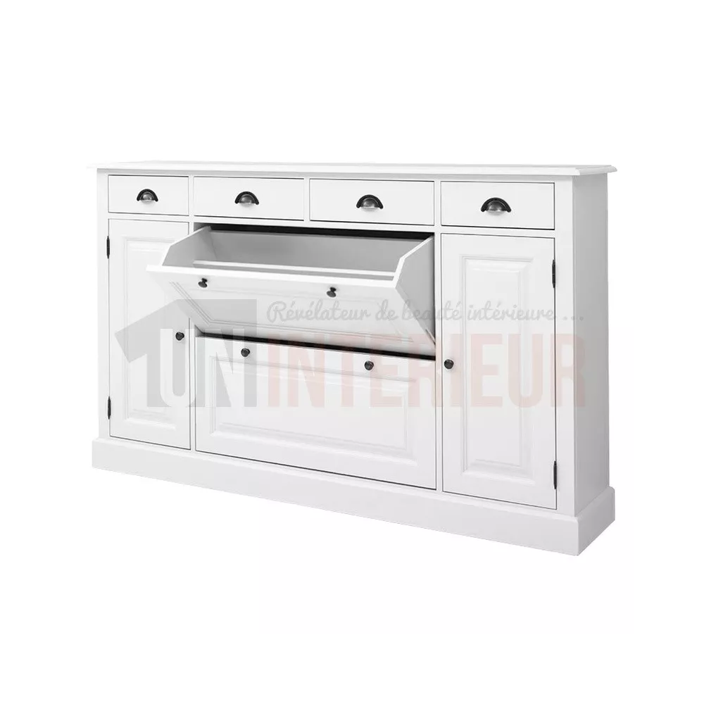 Voici un grand meuble à chaussures en pin massif avec 2 portes et 4 tiroirs.
